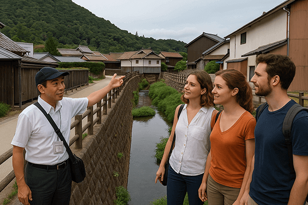 Découvrez la ville de Kurayoshi, avec ses entrepôts aux murs blancs, ses ponts de pierre le long de la rivière Tamagawa, ses anciennes maisons de marchands du quartier Uomachi et ses bains publics fondés à l’époque Meiji — autant de paysages rappelant ceux du manga Quartier lointain.